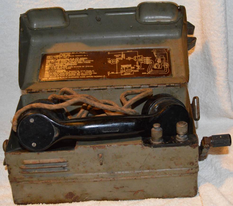 Field Telephone H Mark 111. Designed to provide secure wire communications on the front lines, with a hand cranked magneto generator to "ring up" the other party, instructions on the inner lid
