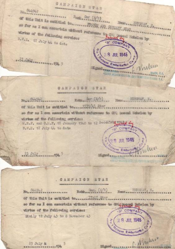 he was entitled to the 1939/45 star, Africa star with 8th army clasp, Italy star, Germany star,