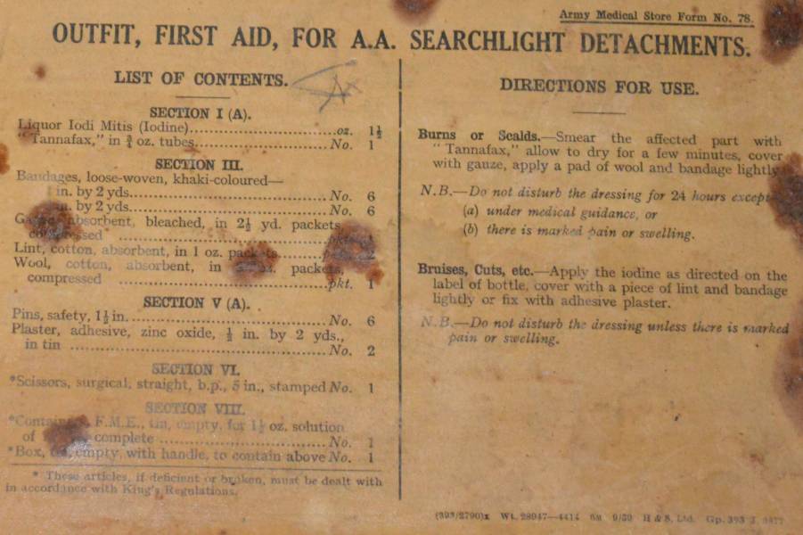 Outfit first aid for A.A searchlight detachments dated September 1939 with a list