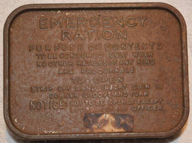 Emergency Ration tin. Dated 1942. A small tin box about the size of a 2-oz. tobacco tin, and contains a fortified chocolate block that was supposed to be eaten only when there was nothing else