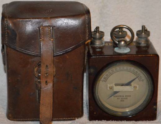 Galvanometer dated 1918, the carring case dated 1917. Missing its carrying strap. Used by Royal Engineers for testing and maintaining electrical circuits for field telegraphy, Morse code communication, and detonator wiring for explosives.