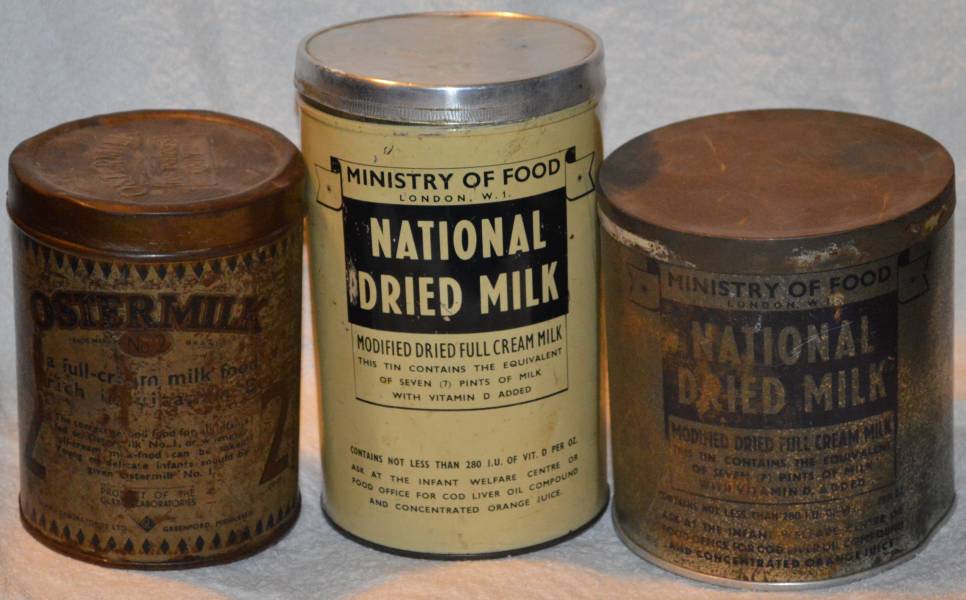 Ministry of Food dried milk tins. The ostermilk tin on the left is dated 1944