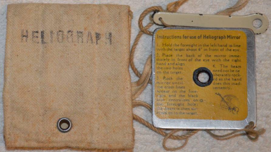 Heliograph.A signaling mirror issued with Royal Air Force survival equipment, including Mae West life vests and inflatable dinghy allowing downed airmen to attract attention from ships or aircraft. |