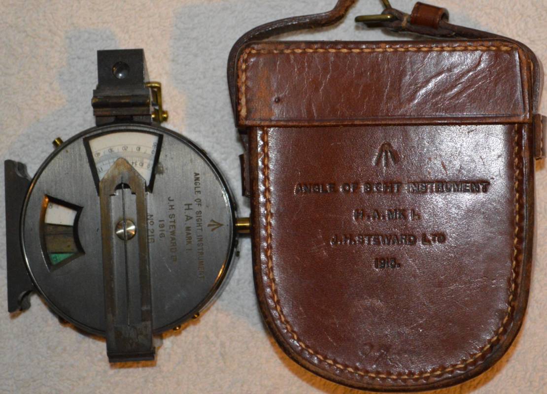 Angle of sight instrument H.A.MK1 made by J.H.SEWARD LTD. dated 1916. An Important artillery tool combining a prismatic compass for direction with a clinometer (inclinometer) for measuring vertical angles, so gunners can calculate precise elevation and traverse for targeting enemy positions, and for anti-aircraft (AA) and field artillery to lay guns accurately.