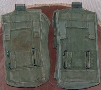 On the back of the case it has two double hooks for attachment to the waist belt as well as a hanger hook to attach to the compass pouch when that article is to be carried above the binocular case