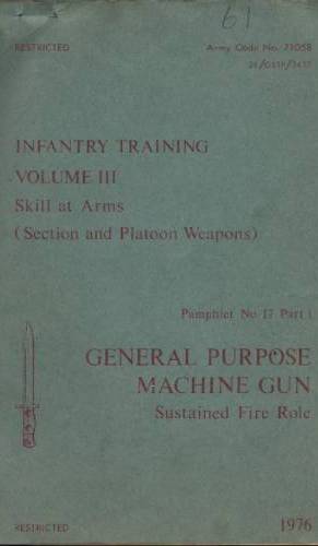Infantry training volume 111 skill at arms dated 1976. The aim of this training booklet is to teach the skills and techniques required by gun teams and gun controllers in the tactical handling of the