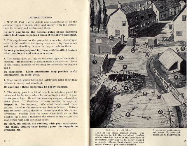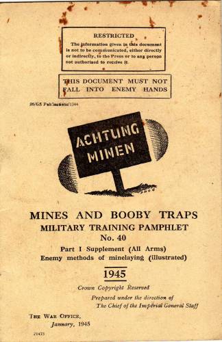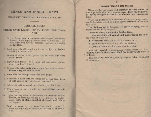 Mines And Booby Traps No 40 supplement. A 20 page book dated 1945 showing British, American and German mines and booby traps. |