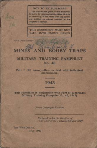Mines And Booby Traps No 40. A 72page book dated 1943 showing British, American and German mines and booby traps. |