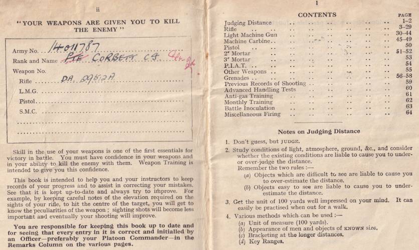 SKILL AT ARMS RECORD BOOK. A 63-page training and record keeping booklet dated 1944 , belonging to a Pte Corbett. |