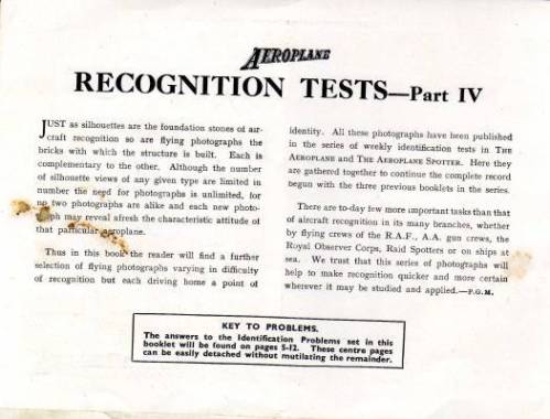 Seventeen page booklet of aeroplane recognition tests dated 1941. |