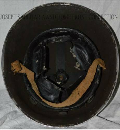 webbing and attached to the helmet at one end by a brass loop, at the other end is a tongueless buckle