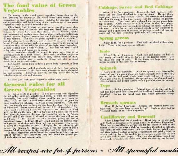 Green Vegetables Ministry of Food leaflet No1.A 5 page pullout leaflet. |