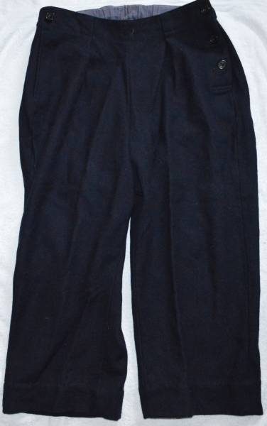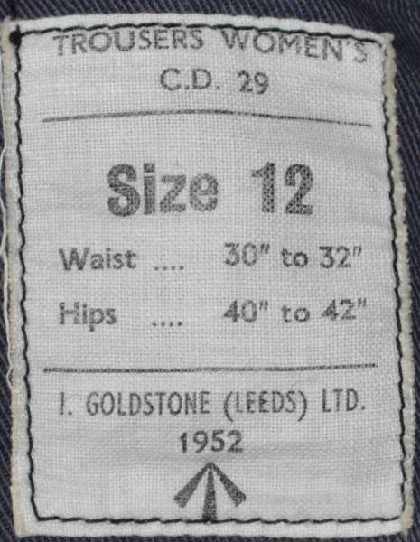Civil Defence trousers Womens dated 1952. They have one side pocket plus a side button up fly and adjustable waistband at the back. |