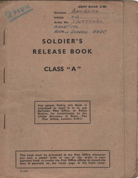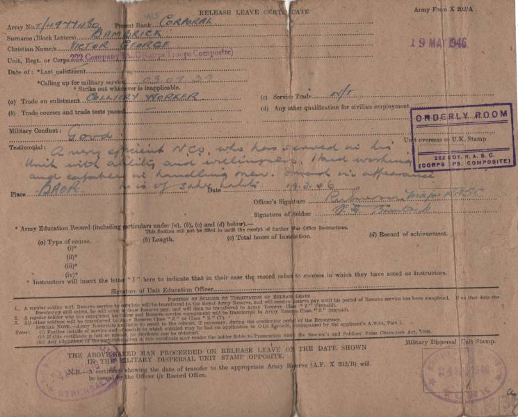 Release book for T/4977480 Corporal Victor Bambrick R.A.S.C.