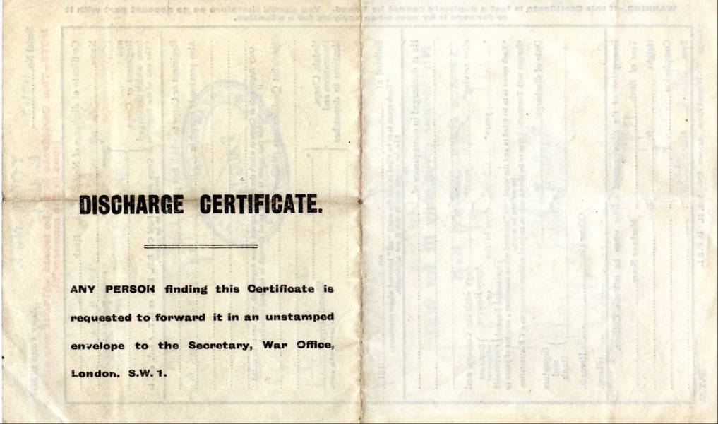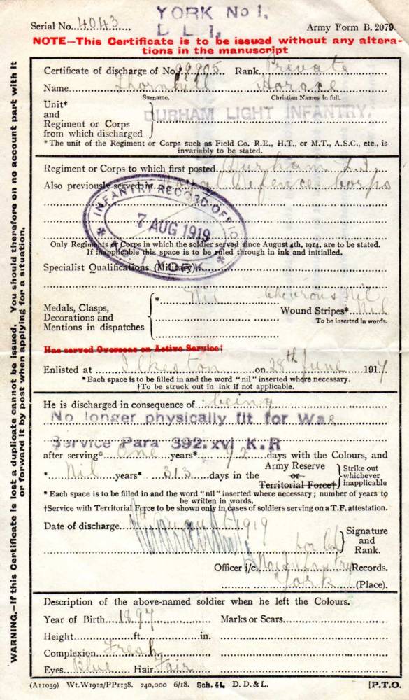 dated 1918 belonged to a Private Horace Thornhill Durham Light Infantry, discharged on the 7 of