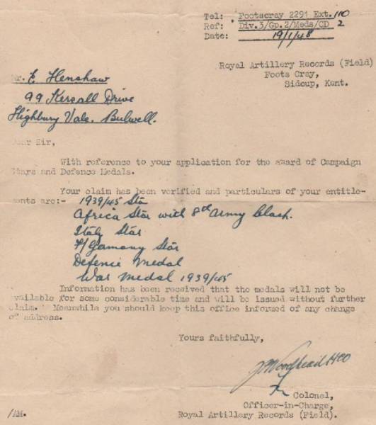he was entitled to the 1939/45 star, Africa star with 8th army clasp, Italy star, Germany star,