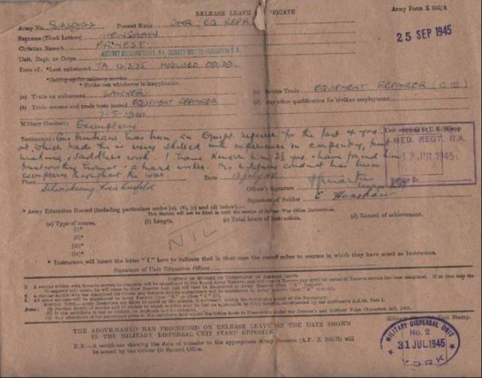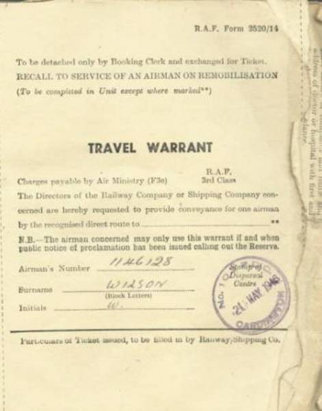 WW11 Malta vateran Wilfred Wilson's release papers and travel warrant. |