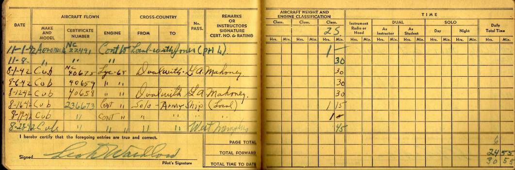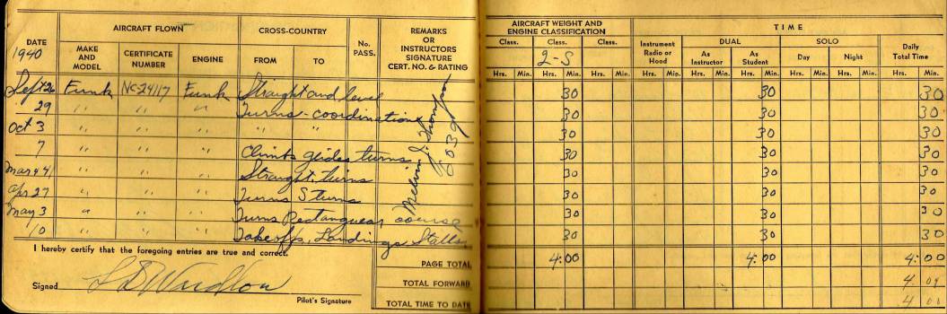 dated from September 26 1940 to October 23 1942 Airplanes flown Funk B, J3 Cub and a what looks