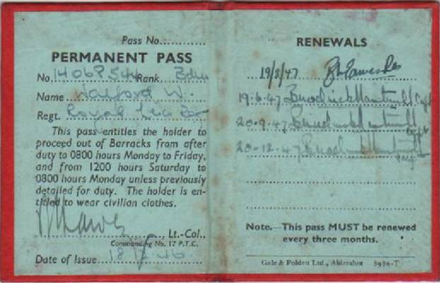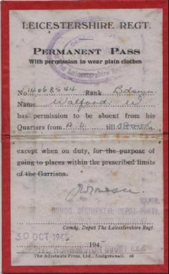 Two Leicestershire Regiment permanent pass books issued in 1946 to a Bandsman Walford.