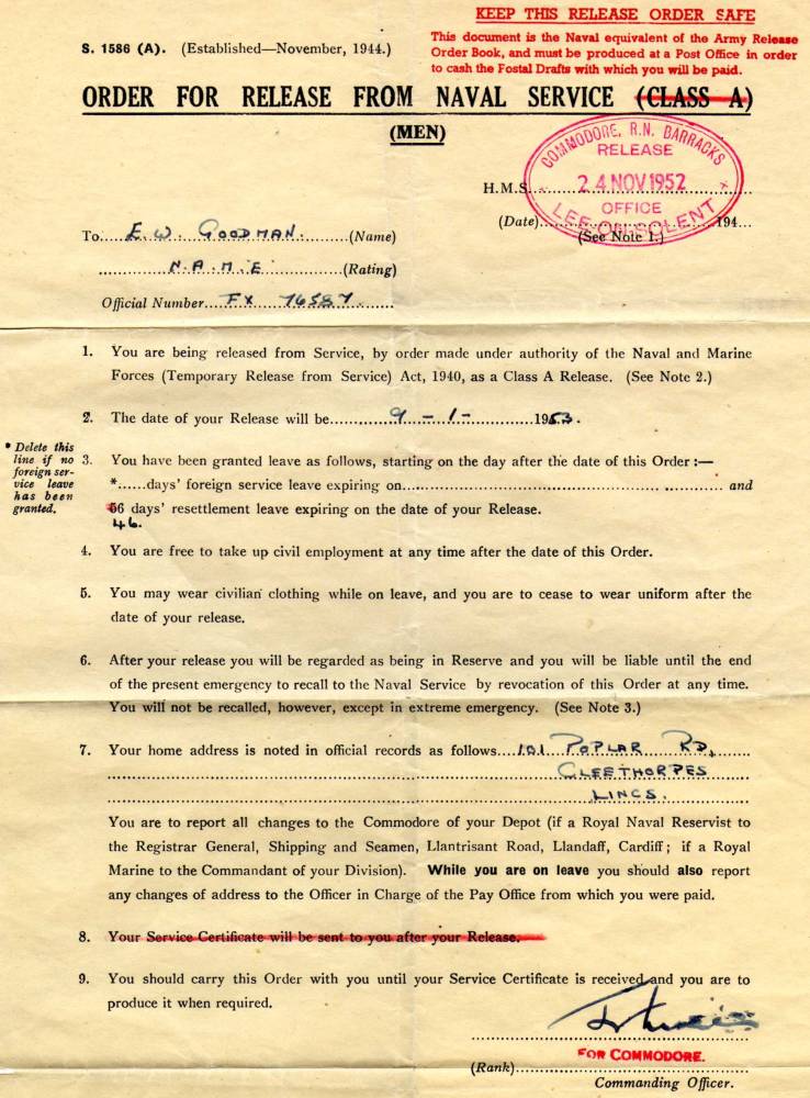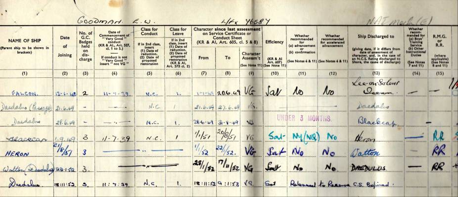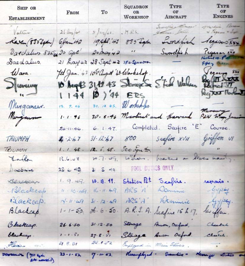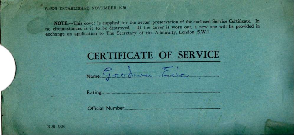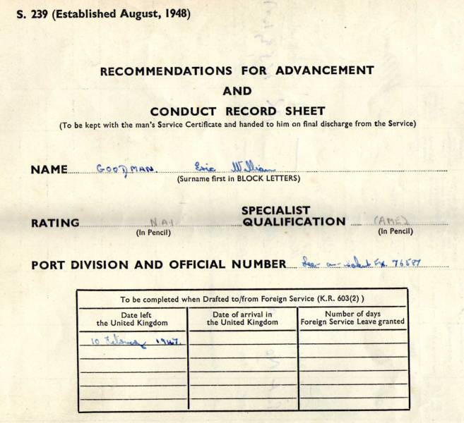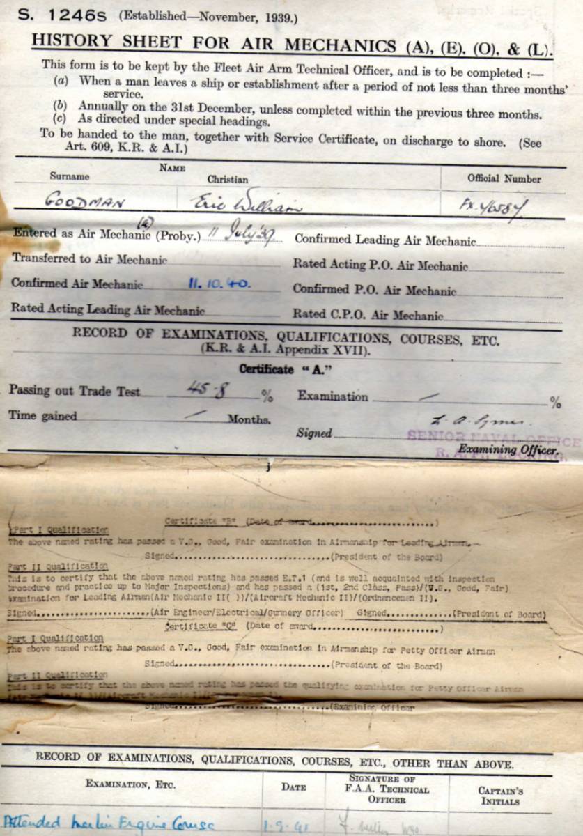 Certificate of service Royal Navy for Eric Goodman Air Mechanic 1939-1953. I have written down here most of Eric Goodman's service history, some of the writing I can not decipher,